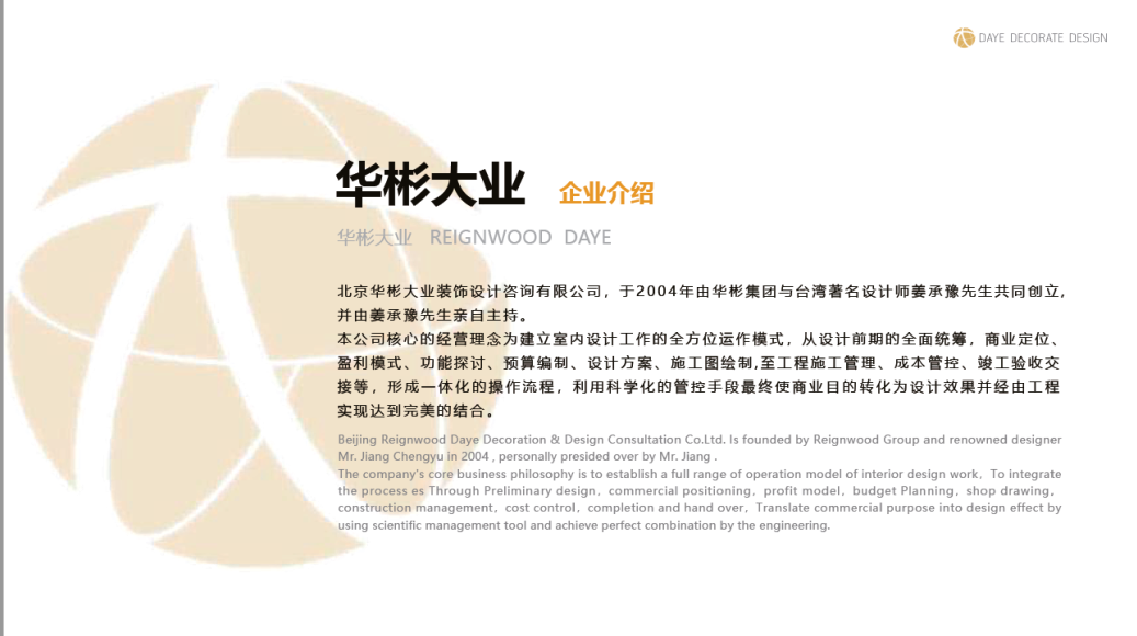 北京华彬大业装饰设计咨询有限公司,于2004年由华彬集团与台湾著名设计师姜承豫先生共同创立,并由姜承豫先生亲自主持。本公司核心的经营理念为建立室内设计工作的全方位运作模式,从设计前期的全面统筹,商业定位、盈利模式、功能探讨、预算编制、设计方案、施工图绘制,至工程施工管理、成本管控、竣工验收交接等,形成一体化的操作流程,利用科学化的管控手段最终使商业目的转化为设计效果并经由工程实现达到完美的结合。